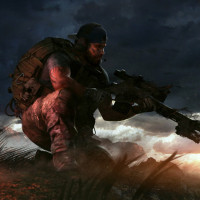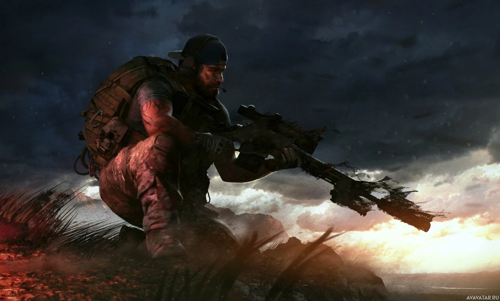 military attire crouched on the ground with his back turned towards us. He is holding a rifle and has a backpack strapped to his shoulders. The setting appears to be during sunset or dawn, given