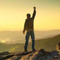 the top of a mountain or hill. The landscape features a valley below and mist rising in the distance, suggesting that it might be taken either at sunrise or sunset. The sky is warmly lit from the sun, indicating either sunrise or sunset. The man appears to be celebrating or perhaps taking a moment of joy and triumph as he reaches this