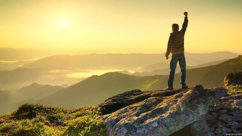 На картине изображен человек, стоящий на вершине горы или холма. Пейзаж имеет долину внизу и туман, поднимающийся на расстоянии, предполагая, что его можно принять либо на рассвете, либо на закате. Небо тепло освещается от солнца, что указывает либо на восход солнца, либо на закат. Человек, кажется, празднует или, возможно, принимает момент радости и триумфа, когда он достигает этой точки зрения.