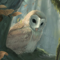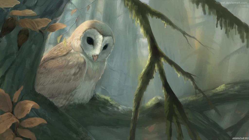 a forest setting. It is sitting on a branch, looking directly at the viewer with its large