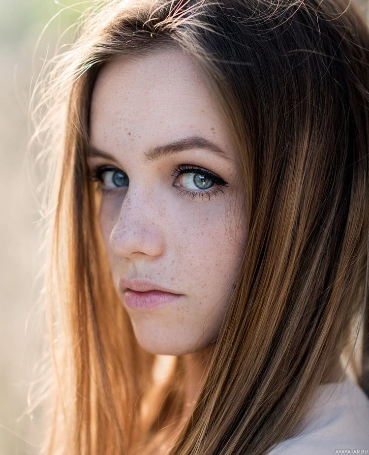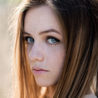 brown hair and blue eyes. She appears to be looking off to the side with