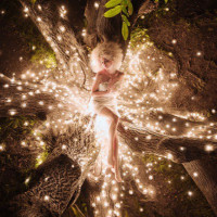 sparkling lights are emanating from her and around her, giving an ethereal appearance to the scene. The light suggests that she might be playing a role similar to