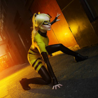 The image shows a person dressed in a costume that resembles the character of Yellowjacket, also known as Wasp from Marvel Comics. They are crouched on an urban setting with a dramatic lighting effect that gives the scene an intense atmosphere.
