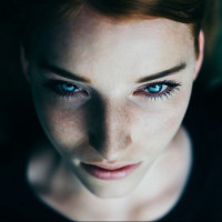 The image shows a woman looking directly at the camera with a contemplative or intense expression. She has distinctive