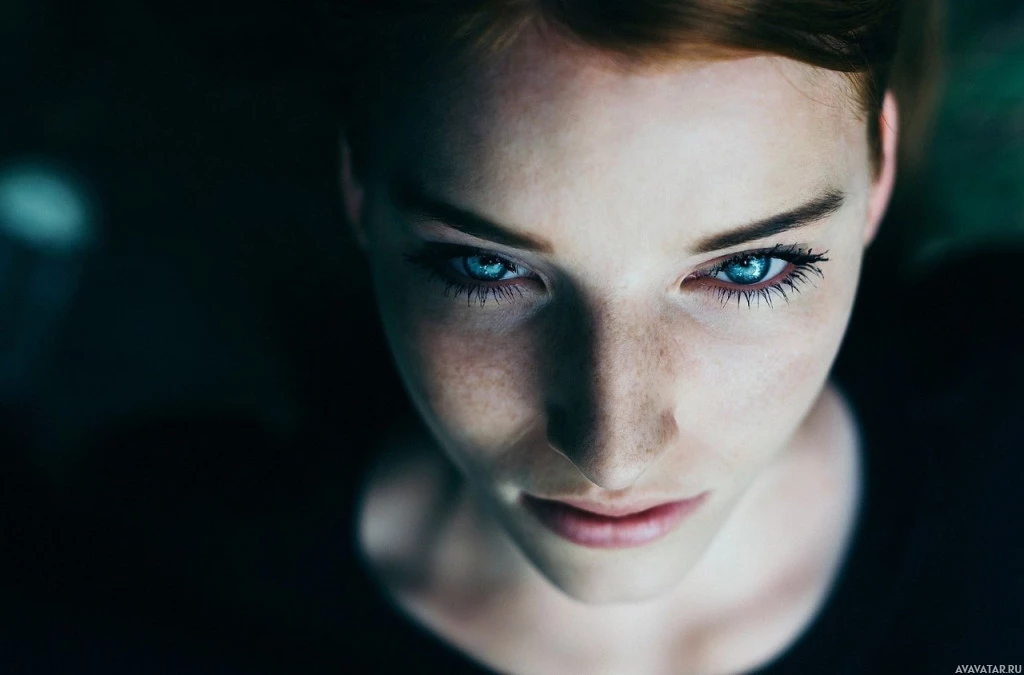 blue eyes that are quite prominent in the picture, which adds to her striking appearance. Her makeup is done in a way that accentuates her features and her overall look is quite sophisticated. The image has a cinematic quality to it, suggesting it might be from a movie or a photography project.