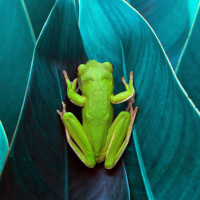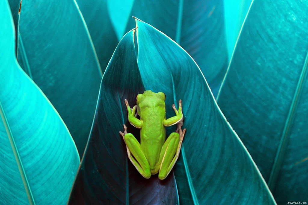 На картинке изображена зеленая лягушка, сидящая среди банановых листьев. Эти листья известны своим ярко-желтым цветом при созревании, но на этом изображении они стали синими. Это создает поразительный контраст с естественным цветом лягушки и подчеркивает ее присутствие в растении.