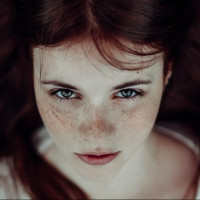 fair skin and distinctive freckles on her cheeks. Her hair is long, straight, and appears to be auburn or red in color. She has prominent