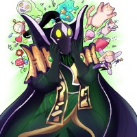 robotic form and is often portrayed as a supportive figure, assisting teammates by dispelling negative status effects with his abilities. The artwork features various items floating around Rubick's head, which could represent the chaotic nature of gameplay or simply be part of