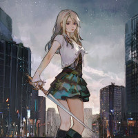 a city skyline under a dark sky, suggesting that the scene might be set in a fantasy or alternative reality due to the presence of the sword.