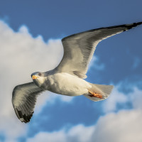 На картинке изображена чайка, которая является птицей. Кажется, что она летит по облачному небу, что, возможно, указывает на то, что она либо мигрирует, либо просто наслаждается полетом.