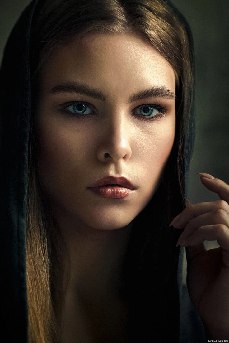 a neutral expression and is looking directly at the camera. Her makeup is minimalistic but accentuates her eyes. The lighting on her face creates a gentle highlight, which adds depth and contour to her features.