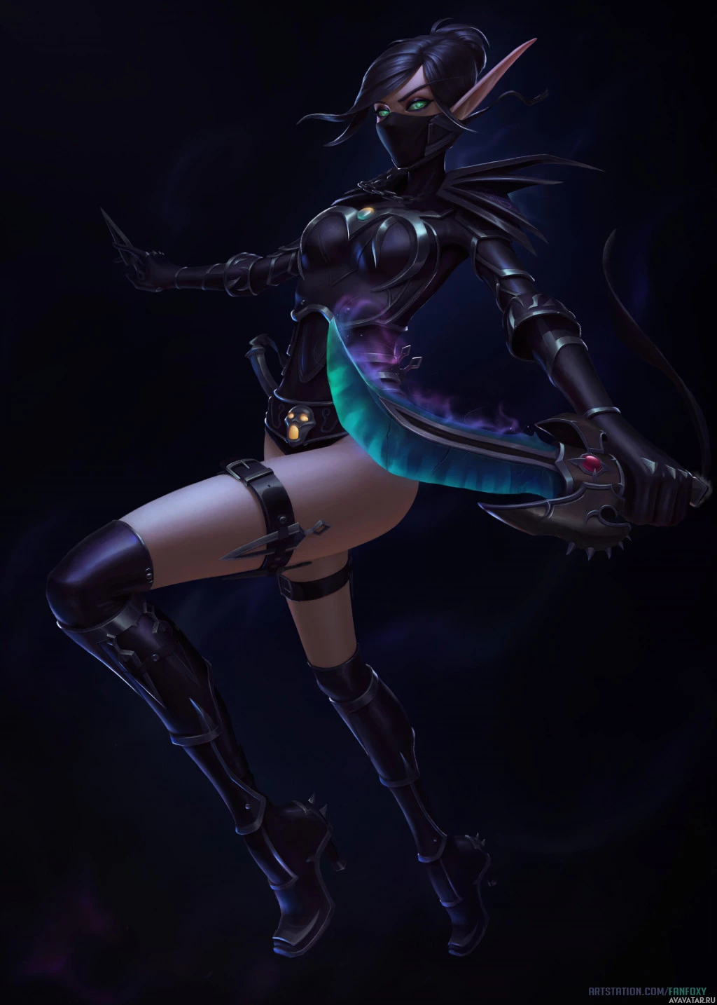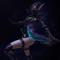 pointed ears characteristic of elves in fantasy settings, and her attire includes armor with spikes on the shoulders, as well as straps and buckles on her thighs. She wields a sword in one hand and seems to be mid-action or posing for