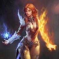 fire magic or a fiery aura around her. Her pose suggests she might be casting a spell or performing some sort of action related to fire or
