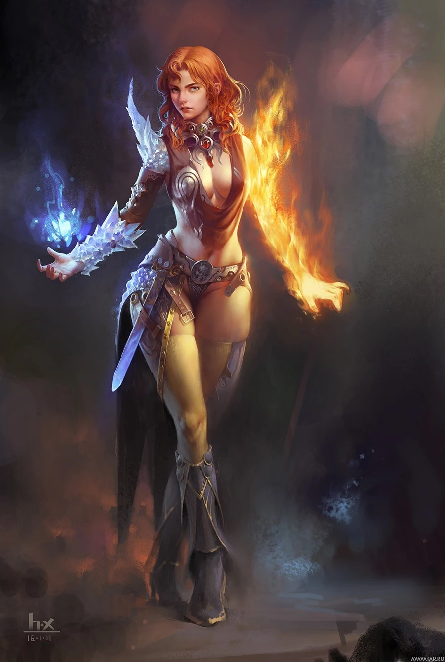 a dynamic pose, suggesting movement or casting a spell. The character is wearing a costume that appears to be made of ice and fire elements, which adds to the magical theme of the artwork. There are flames emanating from her hands, indicating either the use of