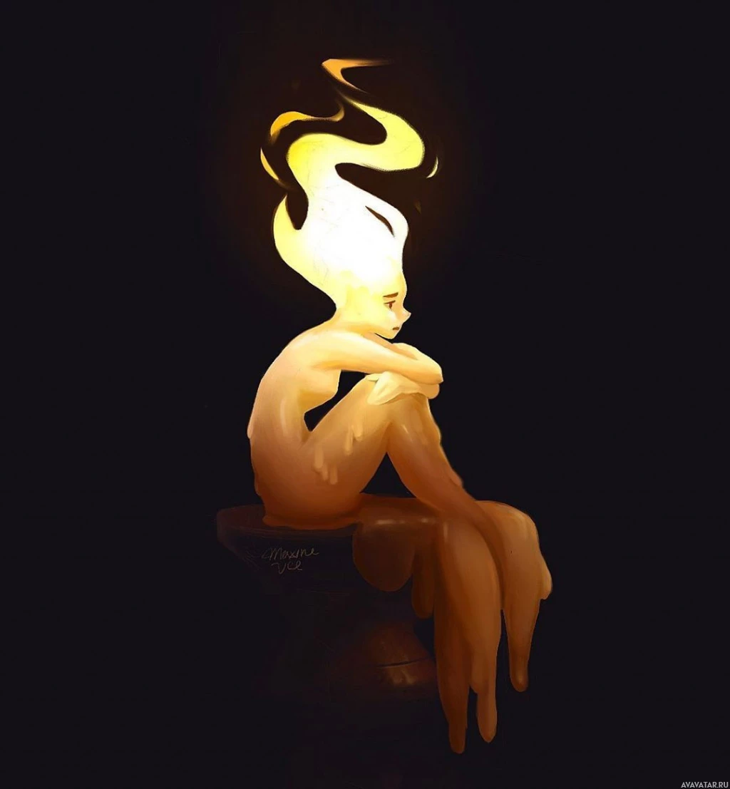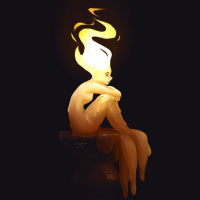 an introspective pose, with their head resting on one hand. The flame atop the character's head is flickering, suggesting it might be a fire or flame-based