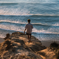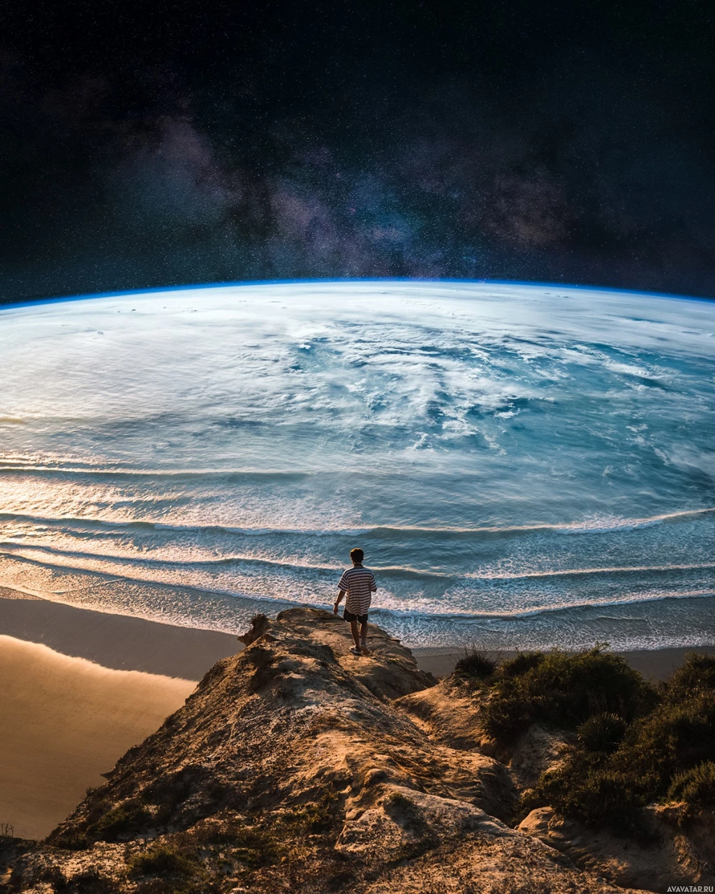 a rocky outcrop overlooking a vast ocean with waves gently rolling onto the shore. In the distance, we can see a coastline under the starlit