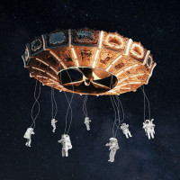 an astronaut on the moon with a spacecraft hovering above. There are several other figures in the background, possibly suggesting additional astronauts or characters related to