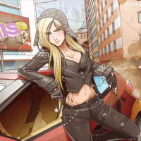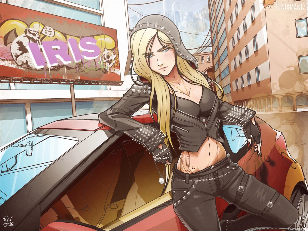 an urban setting, possibly inspired by graffiti-covered buildings and a gritty street atmosphere. The girl has a confident pose, which is typical of a modern