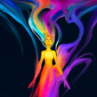 vibrant colors that give the impression of flowing energy or emotions. She has an ethereal quality to her appearance, and it appears that she might be in a state of