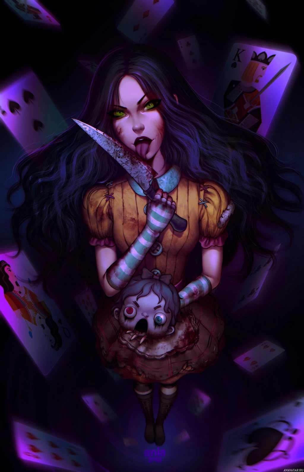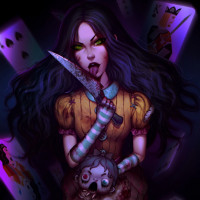 a yellow dress with bloodstains on it, which suggests a darker or horror-themed take on the character. The background consists of playing cards and what appears to be a floating skull, adding to the macabre