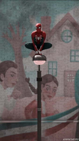 iconic costume which includes a red and blue suit with a spider emblem on the chest, and is known for his ability to climb walls and ceilings using spider webs. In the background, there appears to be a mural or painting depicting two figures that seem to be engaged in an interaction. The overall style of the image suggests it might have been taken during