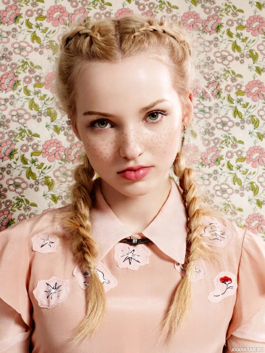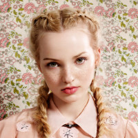 a young woman with blonde hair styled in braids, looking directly at the camera. She has light makeup and is wearing what appears to be a pink floral top or dress with