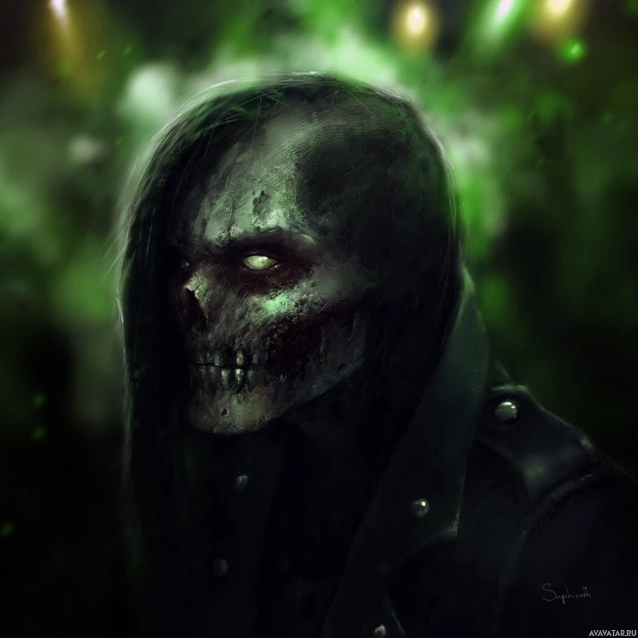 glowing eyes, and a pronounced skull-like appearance with sharp teeth visible through the mouth area. They are wearing what appears to be