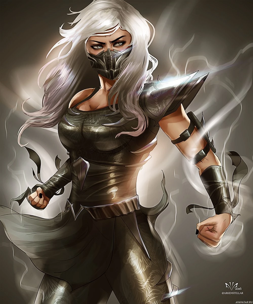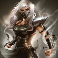 a black bodysuit with metallic detailing that resembles armor, indicating she might be a superhero or warrior. Her right hand is raised as if she's either attacking or defending herself, while her left hand seems to be