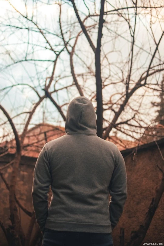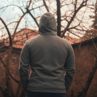 The image shows a person standing from behind. This individual appears to be wearing a hoodie and is turned away from the camera, looking off into the distance or at something out of view. The setting seems to be