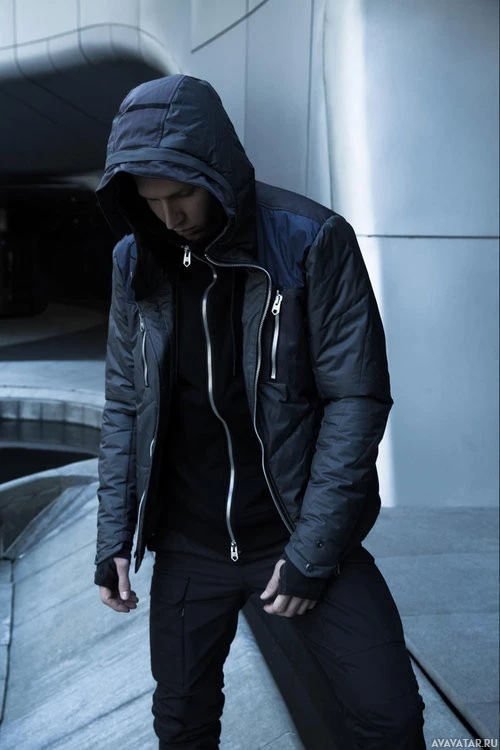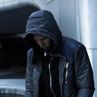a hooded jacket and appears to be in a contemplative pose, with their head bowed slightly and hands tucked into the pockets of the jacket. The lighting suggests it might be either