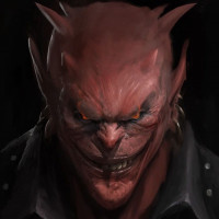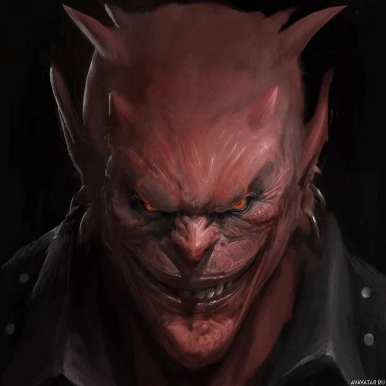 red eyes and is wearing some sort of armor or clothing. His expression is one of anger or menace. This type of imagery is commonly associated with
