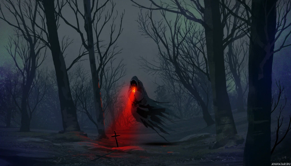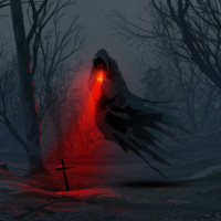 a fantastical scene set in a forest at night. It features a figure that appears to be a ghost or some kind of supernatural entity, with