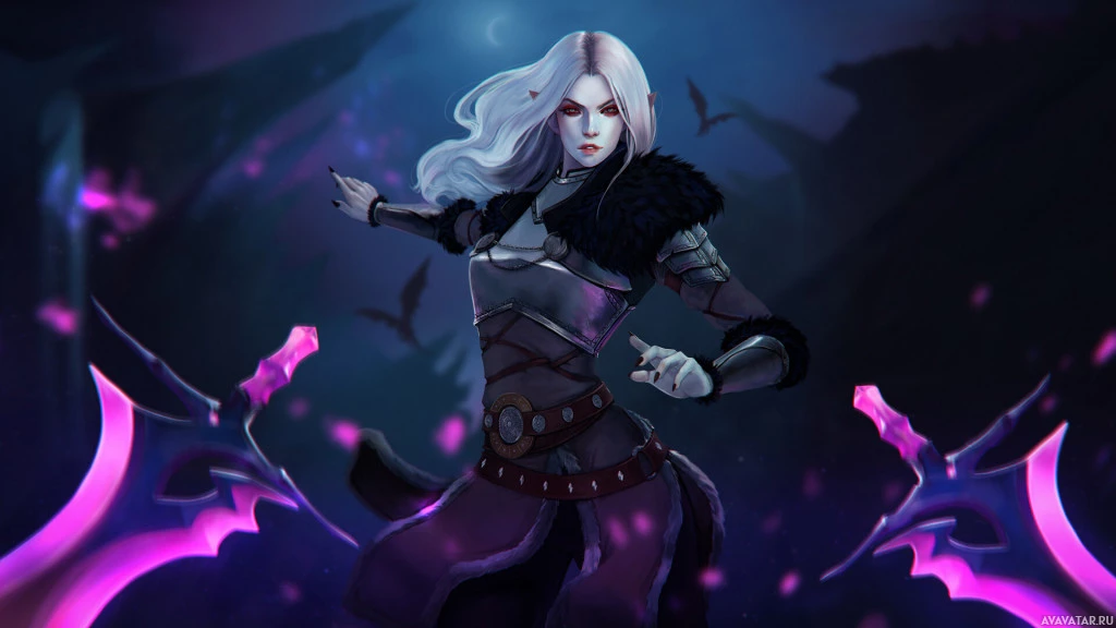 a fantasy character, likely associated with the vampire archetype. The figure is shown in profile, holding what appears to be a weapon or wand with purple and black accents. They have long, flowing hair that seems to blend into