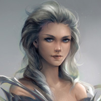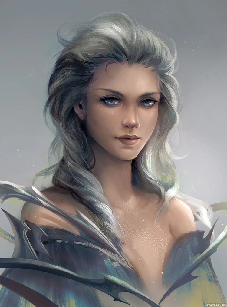 a young woman with pale skin, silver hair, and striking blue eyes. She has an ethereal appearance and is adorned with what appears to be feather-like or aquatic elements, suggesting she might be a character from