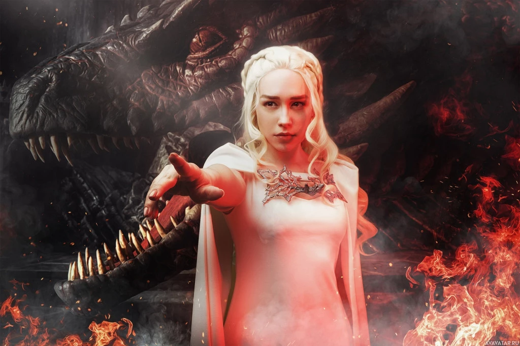white dress and dragon skull necklace, standing confidently with her hand extended towards an unseen force or entity, symbolizing power or control over the scene. The background suggests a setting that could be from the series itself, potentially representing a battlefield or