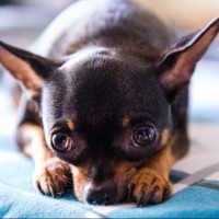 a small dog, which appears to be a Chihuahua, laying down with its front paws stretched out in front of it. It has a somewhat sad or concerned expression on its face, looking directly at the camera. The background is nondescript and does not provide any additional context about the setting.