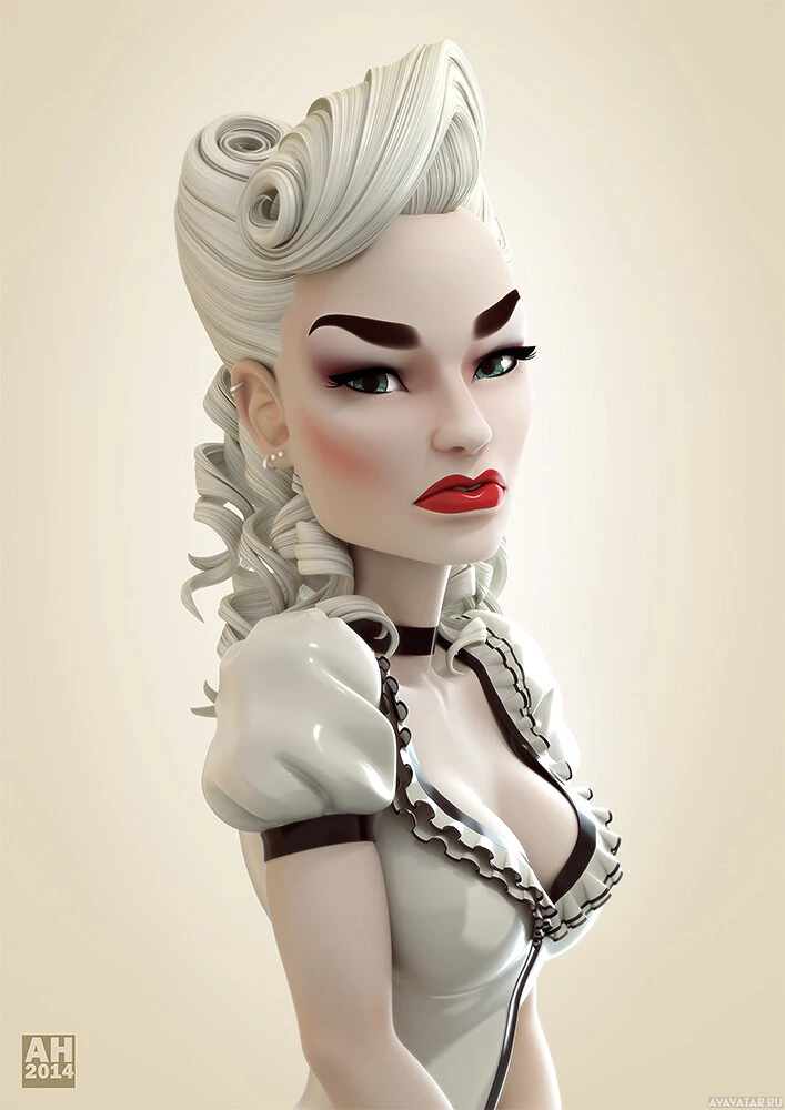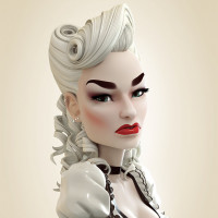 a female character with distinctive white hair styled in an updo, and she has makeup applied to her face. She is wearing a maid's uniform that includes a dress and a collar. Her pose suggests that she might be portraying a character from a narrative or