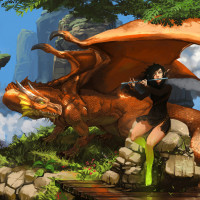 rocky terrain and lush greenery around them. The dragon is depicted with its wings spread wide, showcasing its