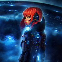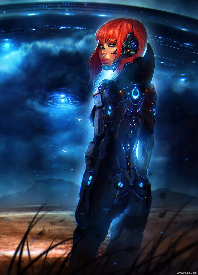 red hair and is wearing a futuristic suit with cybernetic enhancements, which are common in science fiction genres to represent advanced technology or augmented human abilities. The background suggests an extraterrestrial environment with otherworldly elements such as floating rocks and structures that look like they could be part of