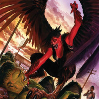 fantasy art featuring a character resembling a demon or harpy. The creature has black feathered wings and