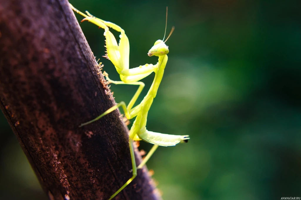 The image features a praying mantis perched on a thin tree branch. It's an insect commonly known for its distinctive appearance, with