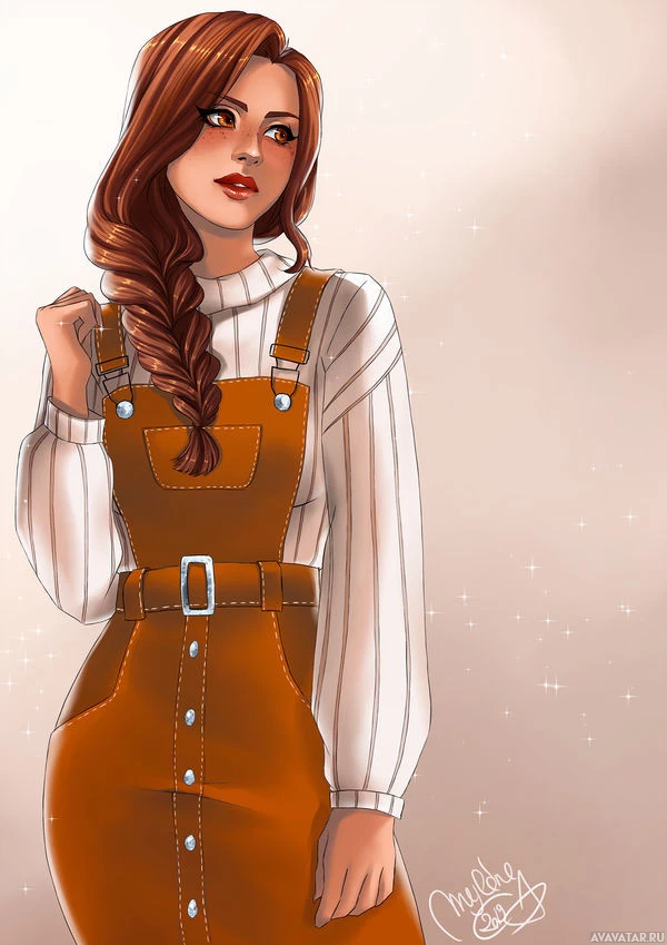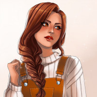red hair, styled in braids. She is wearing a pair of orange overalls, paired with a black and white sweater or jacket that has