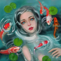 blue eyes. She has a thoughtful or perhaps sad expression on her face as she is partially submerged in water. Surrounding her are multiple koi fish swimming in the same