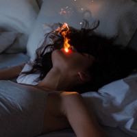 a small flame near her mouth, which could imply she's smoking. There are also some sparkling lights that might be interpreted as fireworks, but it's unclear from the image whether this is actually happening or if it's just