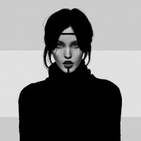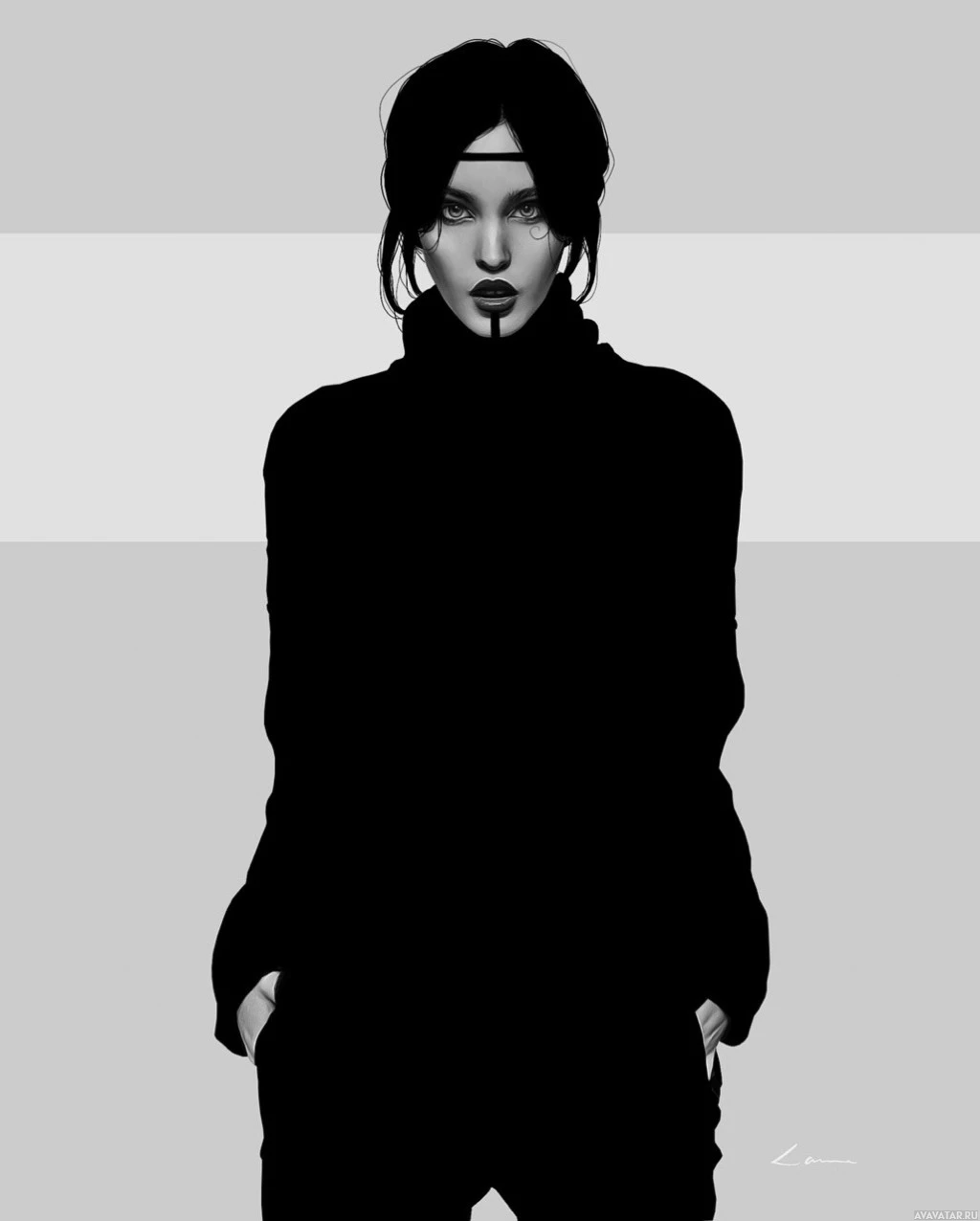 dark clothing, possibly suggesting a fashionable or edgy style. Her pose and expression are confident and poised. The background is monochromatic with horizontal stripes in shades of gray, which provides a stark contrast to the subject's attire, emphasizing her as