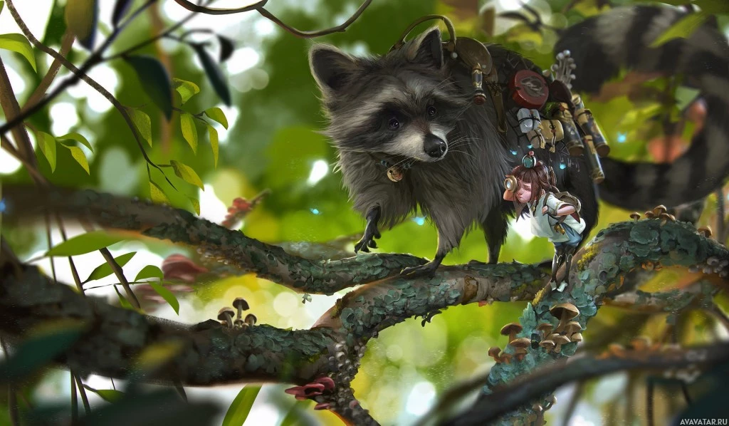 fur texture and eyes that are open wide, suggesting alertness or curiosity. The background includes other branches with leaves indicating a natural