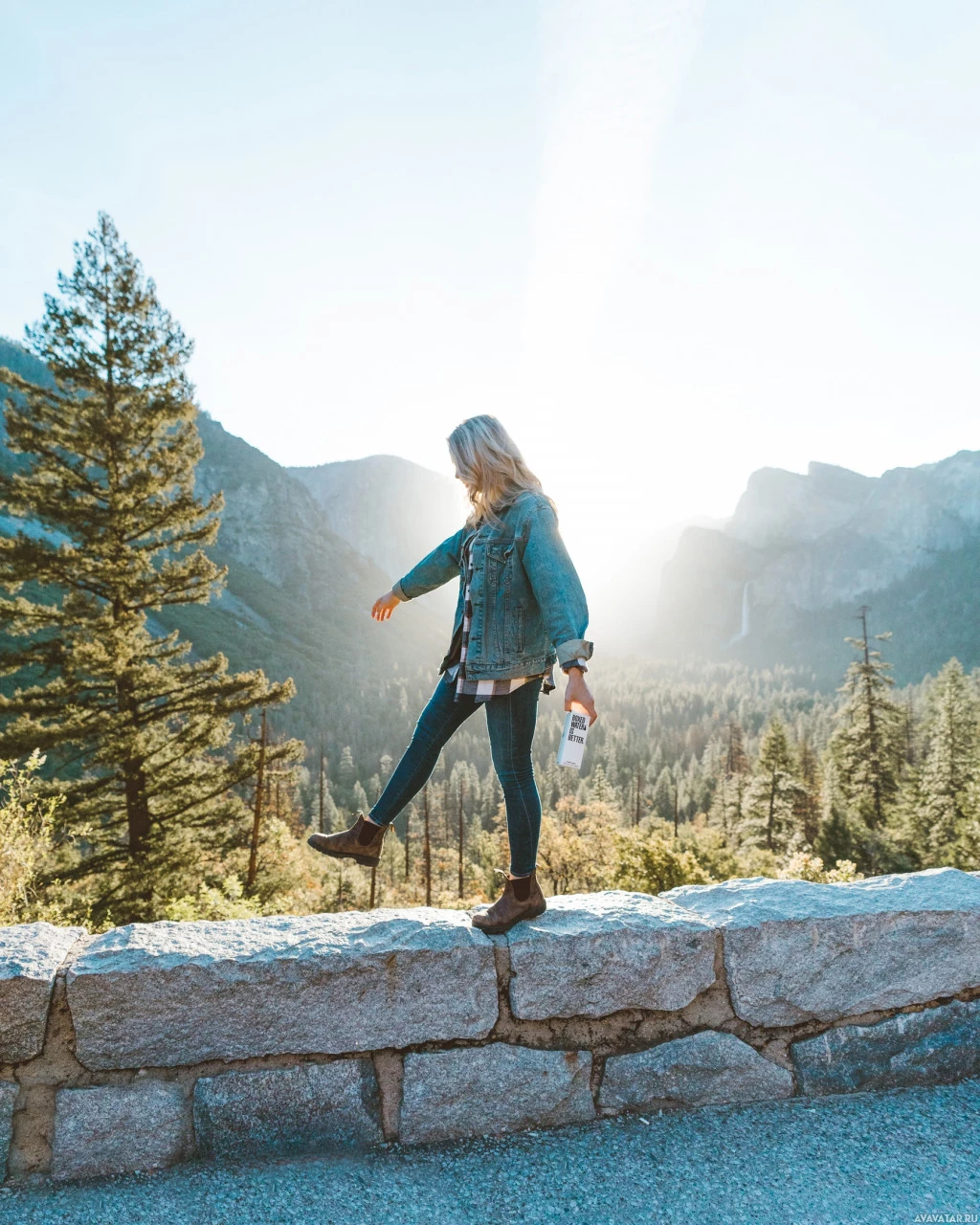 blonde hair. She is standing on what appears to be a stone wall or path in