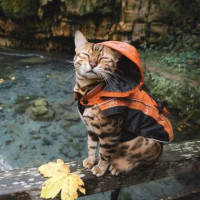 The image shows a tabby cat wearing an orange raincoat and sitting on a wooden bridge over