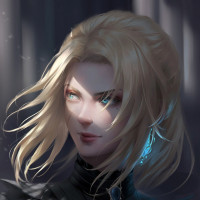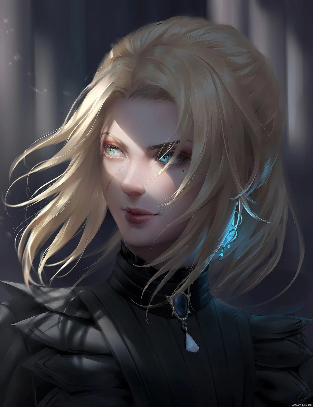 blue eyes and is wearing what seems to be a black outfit or costume with intricate details on the shoulder area and possibly on the chest as well. The background is simple and does not provide much context but gives off an industrial or