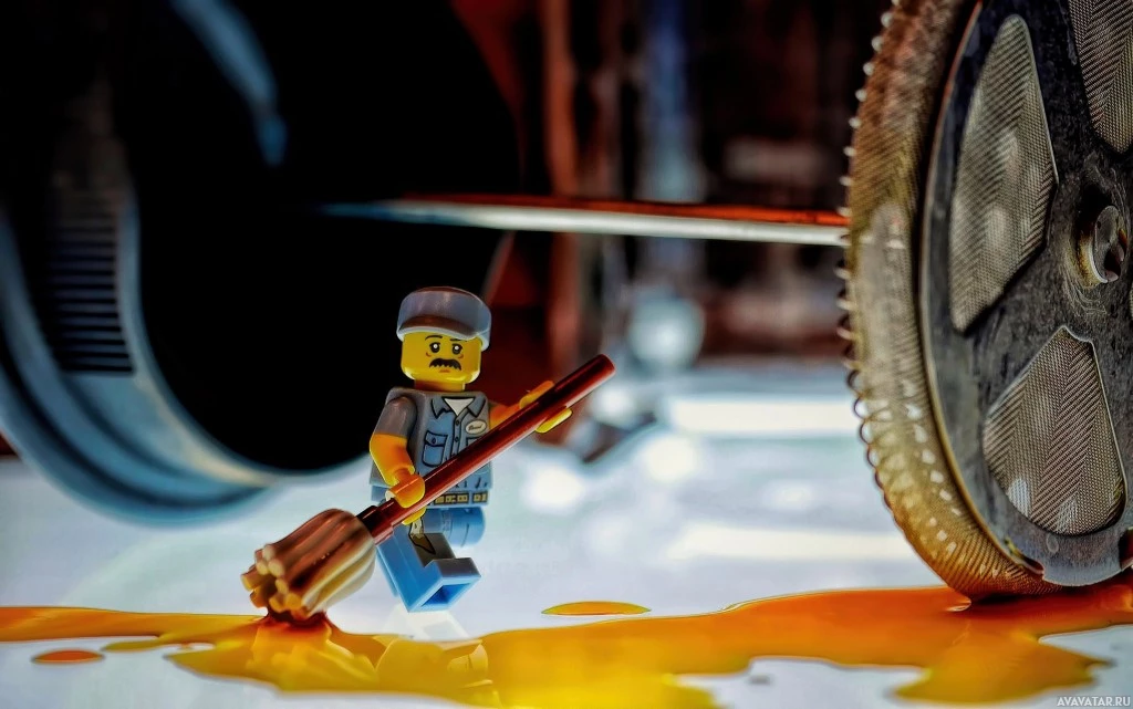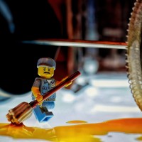 a Lego figure positioned as if it is sweeping or shoveling. Behind the Lego figure, there appears to be machinery or some sort of gear that might resemble